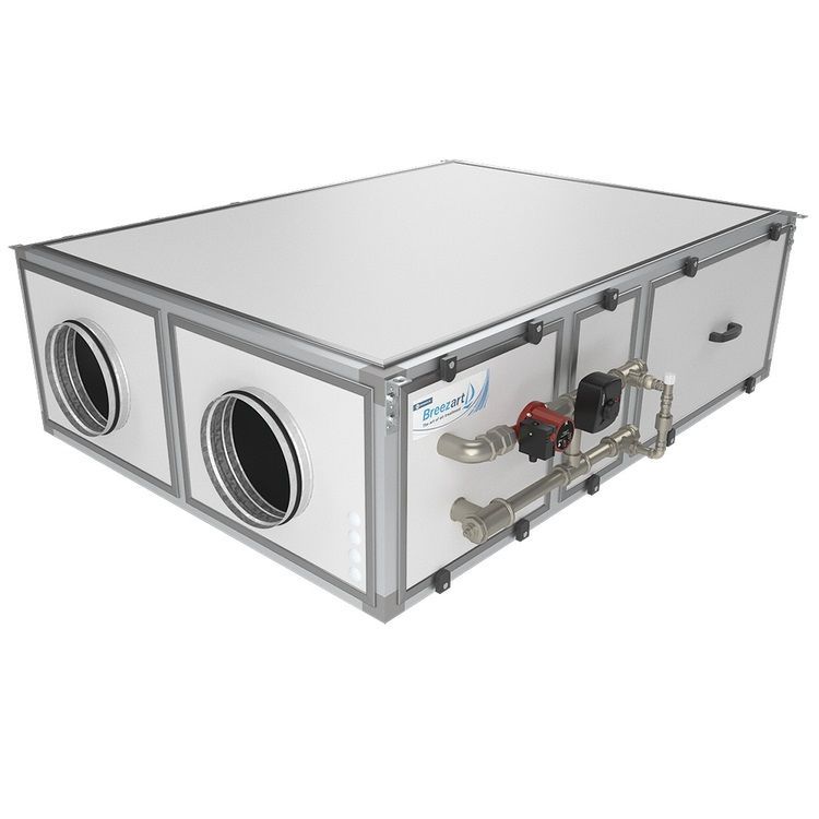 Подвесная приточно-вытяжная установка Breezart 1000FC Aqua RP SB с пластинчатым рекуператором (с системой защиты от замерзания, эффективная работа до -35°С), водяным нагревателем и смесительным узлом с 2-х или 3-х ходовым клапаном (узел подбирается исходя из типа водоснабжения). Комплектуется воздушными клапанами с электроприводом (с возвратной пружиной), системой цифровой автоматики JetLogic с цветным сенсорным пультом управления и всеми необходимыми датчиками. Вентиляторы Ebmpapst серии EC (произведены в Германии).